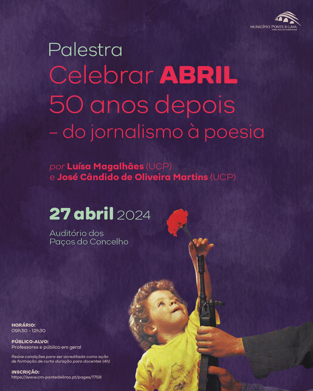 Para assinalar esta efeméride, no dia 27 de abril, promove a palestra Celebrar 5o Anos de ABRIL – da Fotografia à Literatura, que vai decorrer no auditório dos Paços do Concelho, das 9h30 às 12h30, com Luísa Magalhães e Cândido Oliveira Martins, dois oradores, docentes e investigadores na Universidade Católica Portuguesa, nas áreas da Comunicação / Jornalismo e dos Estudos da Literatura / Cultura, respetivamente.