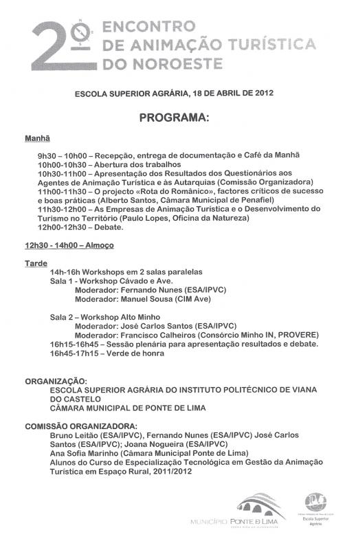 Dirigido especialmente aos profissionais de organizações públicas, aos agentes turísticos e empresários de animação turística, o II Encontro de Animação Turística do Noroeste propõe-se aproximar os diversos agentes de desenvolvimento turístico do Alto Minho, Cávado e Ave, fomentando o diálogo no sentido de encontrar uma dinâmica conjunta, soluções de cooperação que facilitem a operacionalização das atividades e a consequente organização da oferta turística.