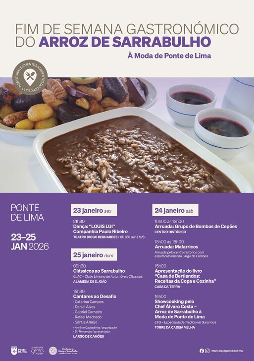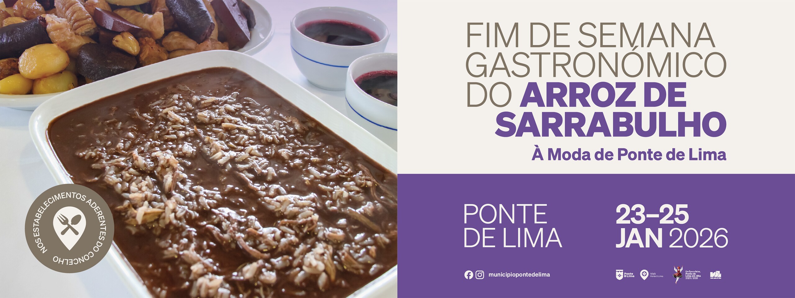 O Município de Ponte de Lima promove, de 23 a 25 de janeiro, o Fim de Semana Gastronómico do Arroz de Sarrabulho à moda de Ponte de Lima, celebrando um dos mais emblemáticos pratos da gastronomia limiana.