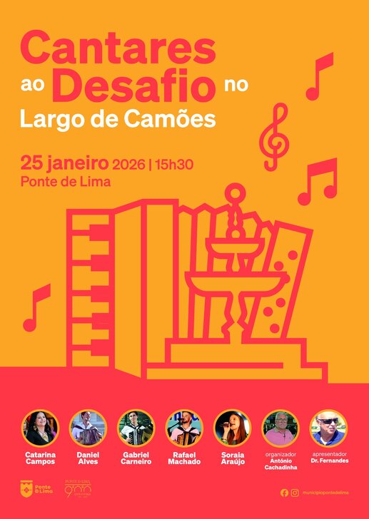 15h30 - Cantares ao Desafio no Largo de Camões com Catarina Campos, Daniel Alves, Gabriel Carneiro, Rafael Machado, Soraia Araújo, apresentados por Dr. Fernandes