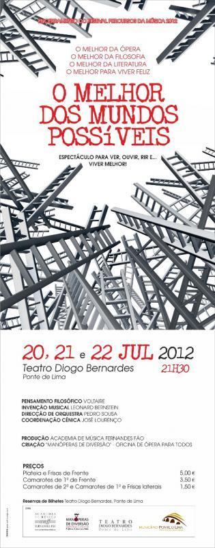A III edição do Festival Percursos da Música encerra com uma mega produção de Ópera denominada "O Melhor dos Mundos Possíveis". Trata-se de um para ver, rir e viver melhor. É o melhor da Ópera, o melhor da Filosofia, o melhor da Literatura, o melhor para Viver Feliz, a não perder no Teatro Diogo Bernardes, nos dias 20, 21 e 22 de julho.