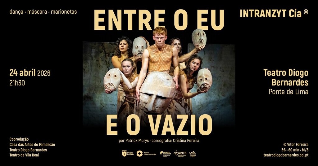 No dia 24 de abril de 2026, às 21h30, o Município Ponte de Lima apresenta no Teatro Diogo Bernardes, em coprodução o espetáculo de dança / máscara / marionetas, “Entre o Eu e o Vazio”, por Patrick Murys e coreografia de Cristina Pereira | Intranzyt Cia.